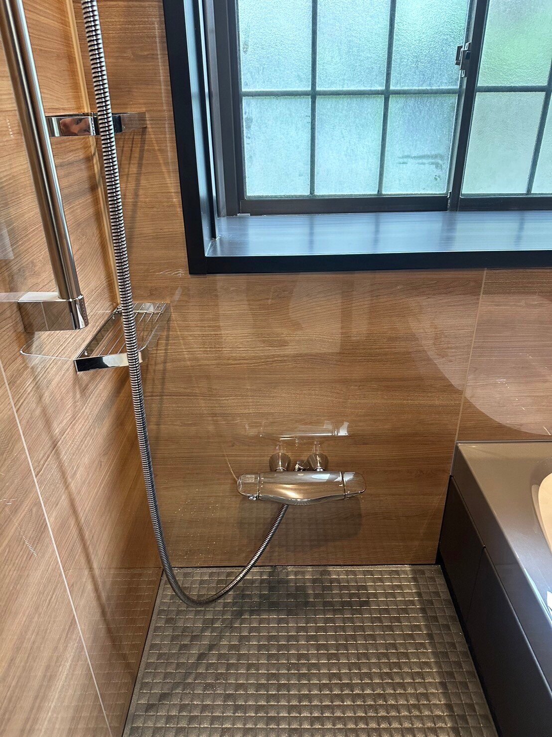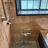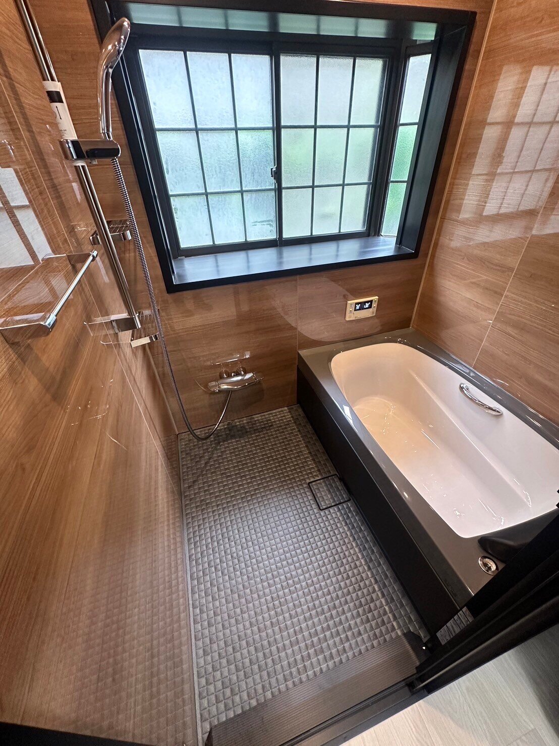 木目調の落ち着いたデザインが印象的なこちらの浴室は、