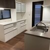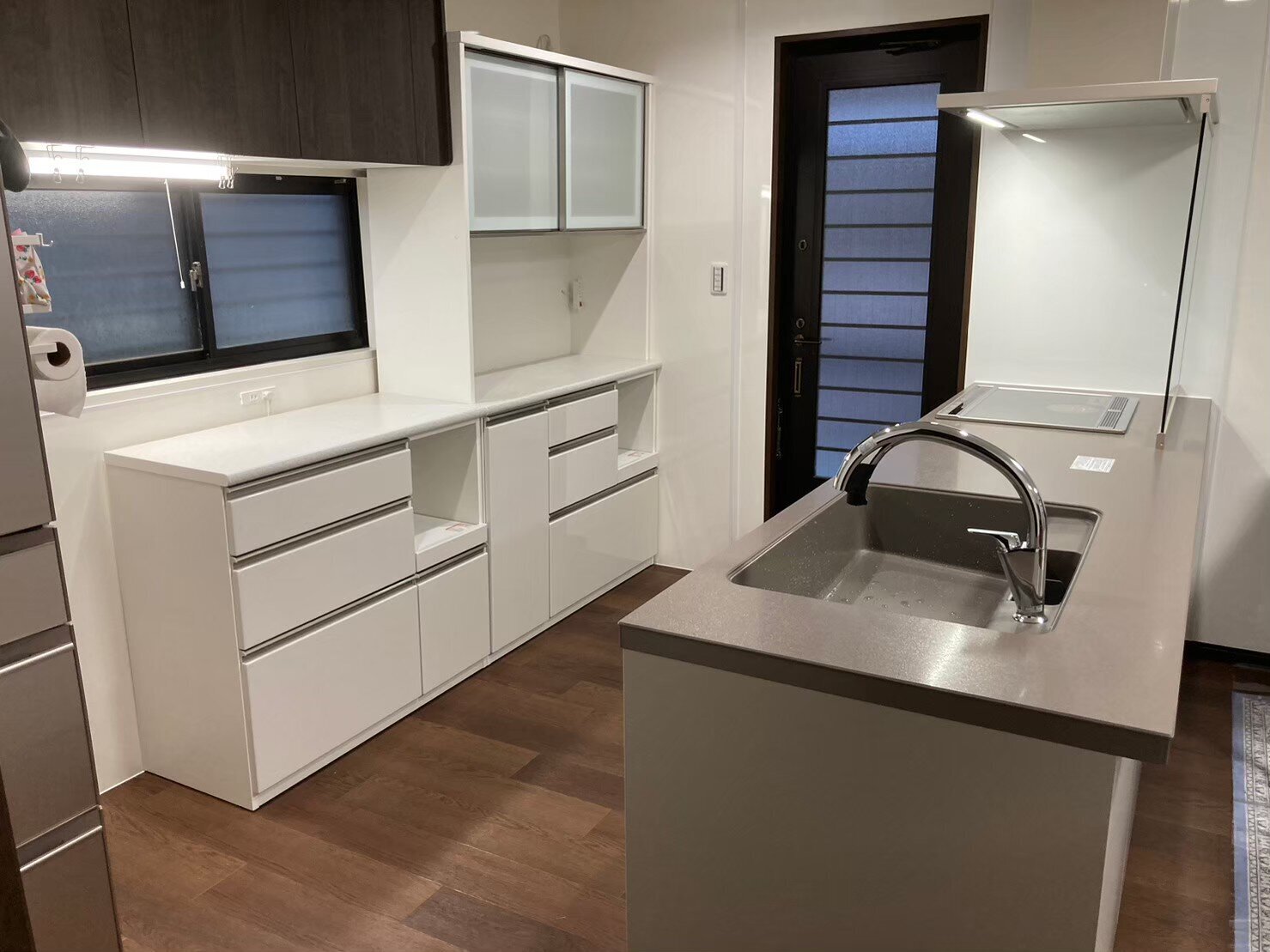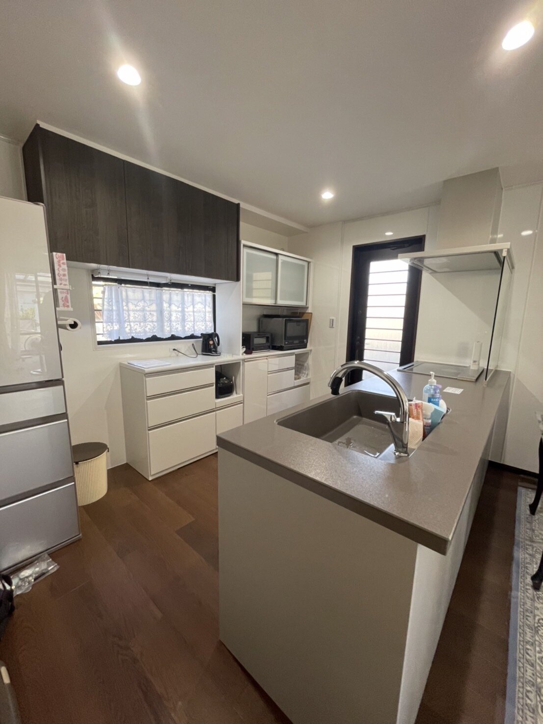 白を基調とした空間に、ダークトーンの吊戸棚がアクセントとなり、デザイン性と機能性を兼ね備えた空間に生まれ変わりました✨