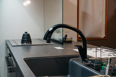 水栓や設備はブラックで統一し、全体のトーンを引き締めながら上質で落ち着いた雰囲気を演出🖤🚿